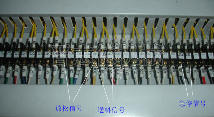 6、后,將機器的送料和放松信號線接入沖床(三條線X7,X4,COM),同時根據需要將急停線也可以接入(兩條線65和66)。