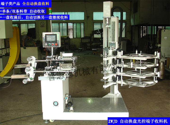 自動換盤端子收料機是專為高速沖床沖壓端子用單條式雙條料帶收取機。屬高端收料設(shè)備,其具有性能優(yōu)越,工作效率高,省時省力等優(yōu)點。當(dāng)一盤收滿時,會自動切換到另一盤繼續(xù)工作。中間不需停機,是當(dāng)前先進的自動化收料設(shè)備。
