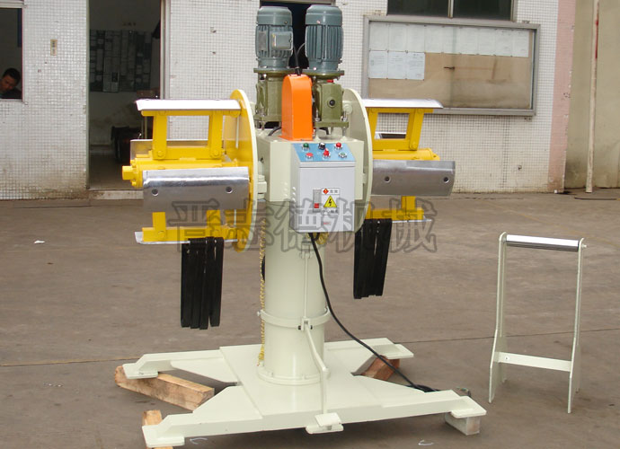 晉志德雙頭材料架由底座、機架、轉軸、馬達、電箱組成,其中轉軸上均勻安裝有兩個收料主軸,兩個收料主軸以轉盤為中心對稱設置且中軸線相重合;收料主軸上配有呈弧形的支撐塊,支撐塊頂部呈圓弧形以配合料卷的內圓料管,支撐桿與支撐塊組合后中間開設有卡槽,卡槽將支撐塊分割為對稱的兩半組成漲縮筒,雙漲縮筒的結構,確保了雙頭材料架實現了無停機快速下料生產之目的。