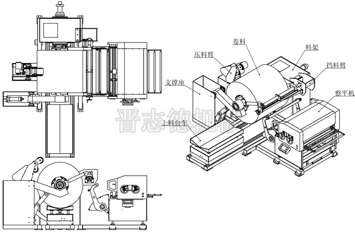 由中板三合一送料機搭配沖床組成的沖壓生產線實現全自動化的作業流程,從原材料入料裝料、整平、送料,至自動出料完全高速作業,出料速度達到每分鐘18米,降低成本,提高生產效率。中板三合一送料機NCSF6-900適用于材料厚度0.5-4.5mm中板卷材,下圖為其總裝配圖: