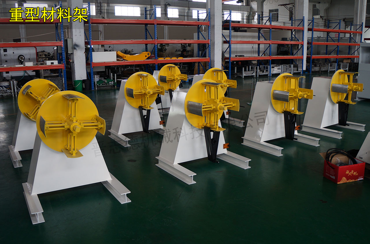 重型材料架具有價格經濟實惠、載重量大、定制化程度高、故障率低、操作簡易、維護方便等優點,是卷狀板材實現自動化生產常用的放料、開卷設備,它即可搭配整平機、送料機組成完整的沖壓生產線,也可直接與送料機配合組成簡易型沖壓生產線,同時可作收料之用途。